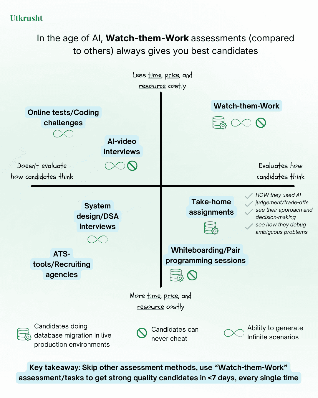Utkrusht was built from the ground up around one core belief: the only accurate way to evaluate tech candidates is to actually watch HOW they solve a real problem in a real environment, live. In other words, simply watch-them-work.